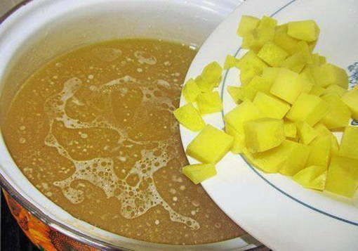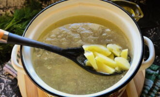 - Voeg de gebakken groenten toe aan de kokende bouillon, leg de gesneden aardappelen op dezelfde plaats en kook nog eens vijf minuten op middelhoog vuur.