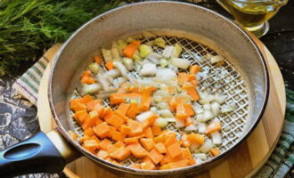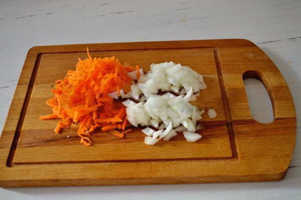 Snijd ondertussen de gepelde uien en wortelen. Verhit plantaardige olie in een koekenpan en bak groenten erin tot ze zacht zijn, onder voortdurend roeren zodat er niets aanbrandt.
