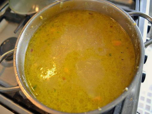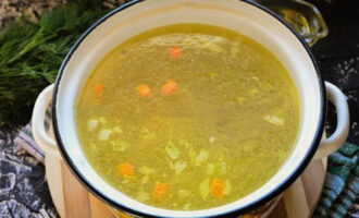 - Kook de soep nog 5 minuten, haal dan van het vuur, dek af en laat 10-15 minuten staan.