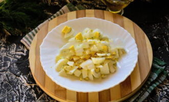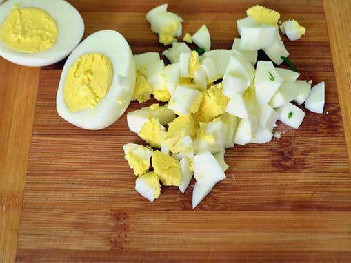 - Kook ondertussen hardgekookte eieren, pel ze en snijd ze in kleine blokjes.