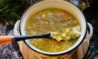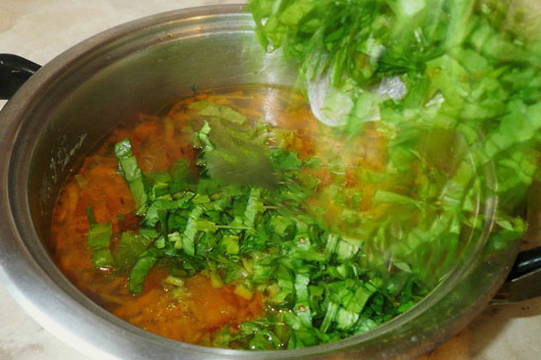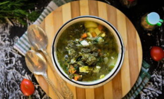 - Voeg greens toe aan de afgewerkte soep, meng alle ingrediënten en laat 10-15 minuten onder het deksel trekken. Eieren kunnen in dit stadium of vlak voor het opdienen worden toegevoegd.
