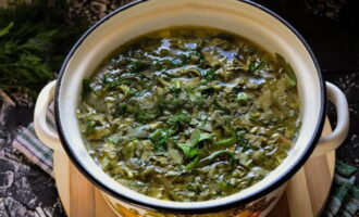 Terwijl de bouillon kookt, spoelt u de zuring, spinazie en dille, sorteert u op bedorven bladeren zodat ze de smaak van het gerecht niet bederven en snijdt u ze fijn. Als de soep kookt, voeg je er kruiden aan toe, roer je, houd je het een paar minuten in brand en zet je het vuur uit.
