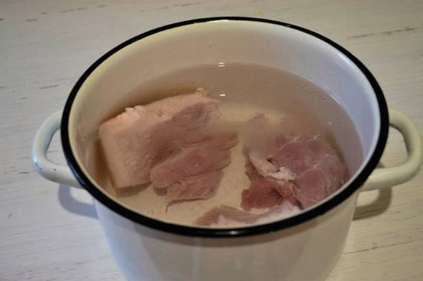 - Om de bouillon te bereiden, spoelt u het vlees eerst onder stromend water en snijdt u het in grote stukken. Doe het varkensvlees in een pan, bedek het met water, zet het op het vuur en breng aan de kook.