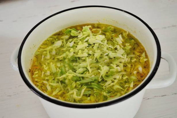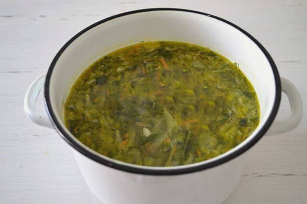 Dek de pan af met een deksel en laat 10-15 minuten staan. Wanneer de koolsoep doordrenkt is, giet ze in borden en serveer. Deze soep gaat goed samen met koude zure room of mayonaise.