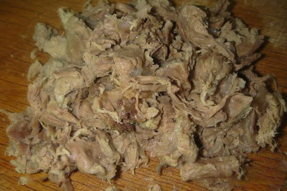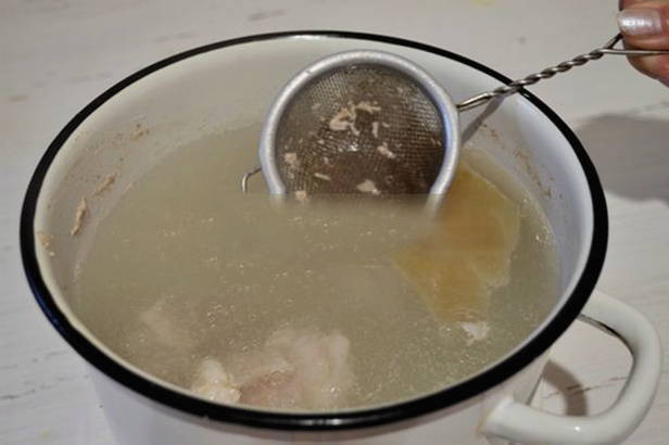 - Kook het vlees een uur lang en verwijder regelmatig het resulterende schuim van het oppervlak van de bouillon. Haal het bereide vlees uit de pan, scheid van het bot en hak het fijn, zeef de bouillon door een fijne zeef. Doe dan alles terug in de pan en zet het op laag vuur.