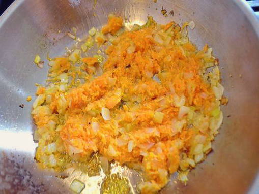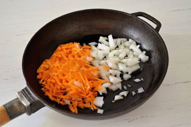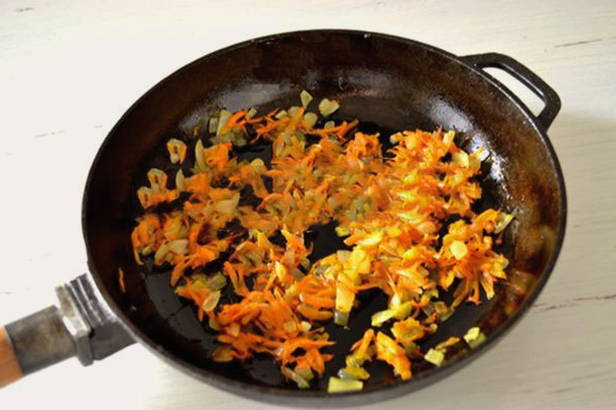 - Verhit plantaardige olie in een koekenpan, voeg wortelen en uien toe en bak op middelhoog vuur tot ze zacht zijn, onder voortdurend roeren. Voeg vervolgens de gehakte knoflook toe, meng de groenten goed en bak nog een paar minuten.