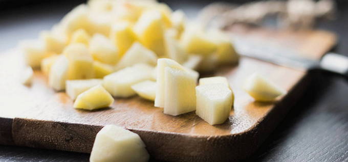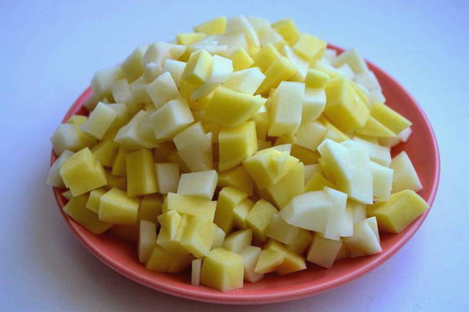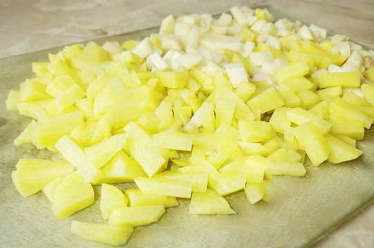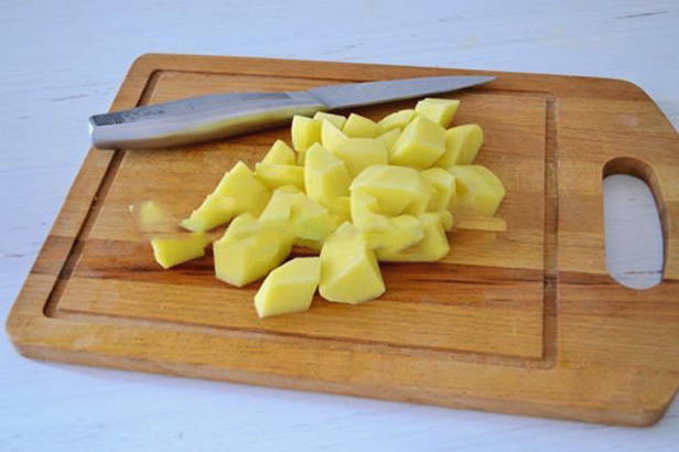 - Snijd de voorgewassen en geschilde aardappelen in kleine stukjes.