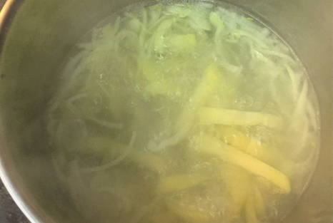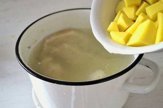 Aardappels schillen en in kleine blokjes of reepjes snijden. Voeg toe aan de bouillon en kook tot de aardappelen gaar zijn.