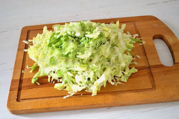 - Spoel intussen de kool, scheur de bovenste rij bladeren af en hak de rest van de kool fijn.