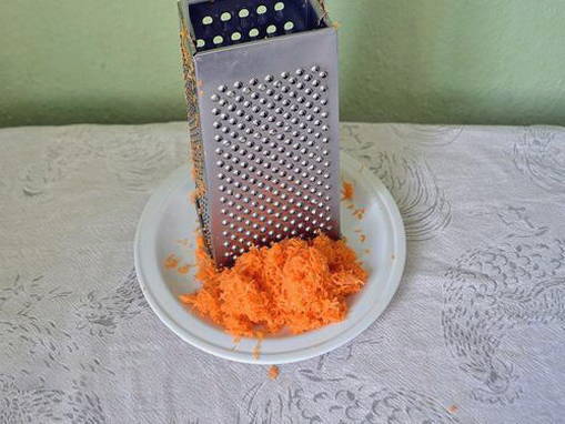 - Rasp de eerder gewassen en geschilde wortelen op een grove rasp of snijd ze in dunne reepjes.