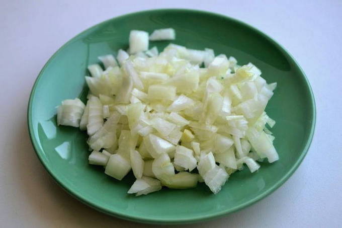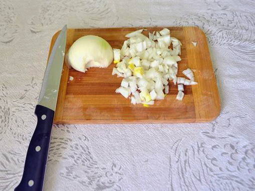 - Terwijl de kip kookt, schil de ui en snijd in kleine blokjes.