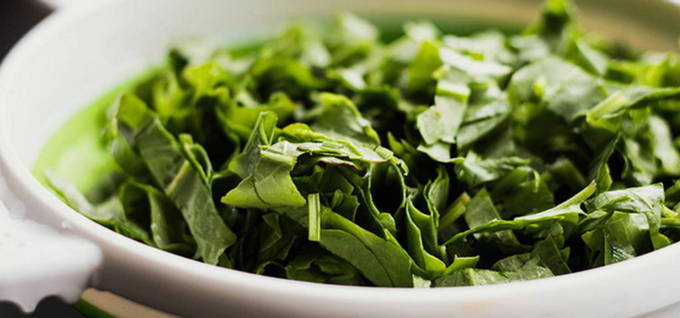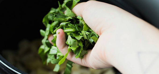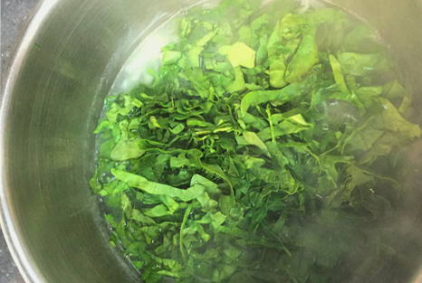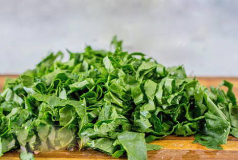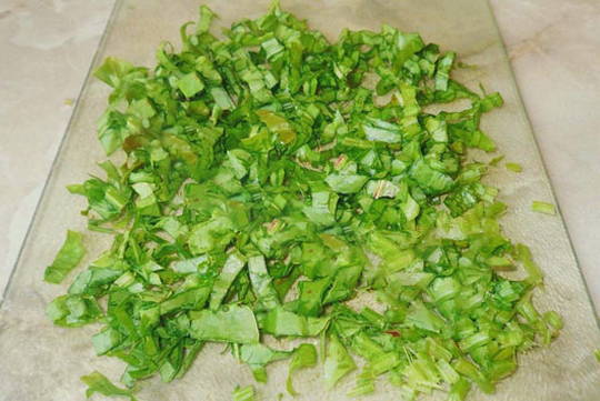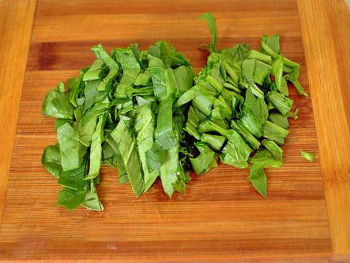 - Spoel de spinazie en de zuring onder stromend water, zoek naar rotte bladeren en snij in reepjes van ongeveer 1 cm breed.