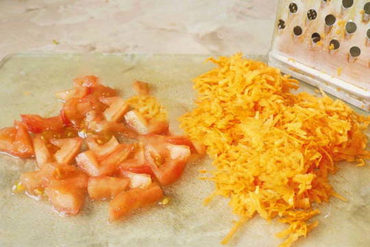- Schil ondertussen de wortelen en rasp ze op een grove rasp, of snijd ze in dunne reepjes. Snijd de tomaat in blokjes, na het verwijderen van de schil, als hij dun is, omdat hij anders tijdens het kookproces uit elkaar gaat en in de soep valt. Als u rassen met een dikke schil gebruikt, hoeft u deze niet te verwijderen.