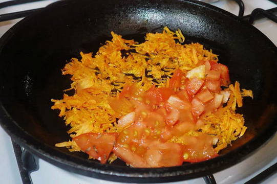 - Doe de kruiden en geraspte of gehakte zaden in een pan met verwarmde plantaardige olie. Bak ze letterlijk een halve minuut op middelhoog vuur om de smaak open te laten komen, voeg dan de gesneden tomaat en wortel toe en bak een paar minuten tot de wortel zacht is.