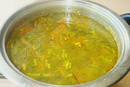 - Kook de soep na het koken 5-7 minuten op middelhoog vuur en voeg dan de ingeblikte zuring, laurierblaadjes, zout en peper toe. Meng alle ingrediënten grondig.