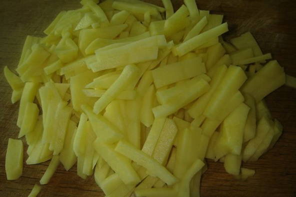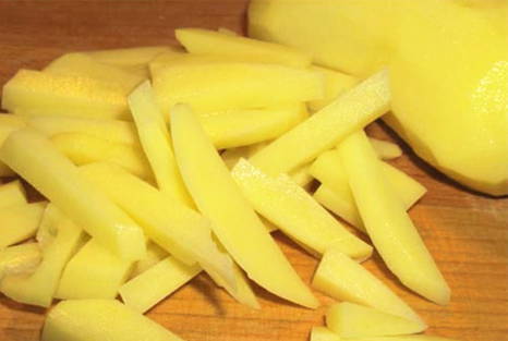 - Snijd de geschilde aardappelen in reepjes, spoel ze af onder koud water en doe ze in een pan met vlees.