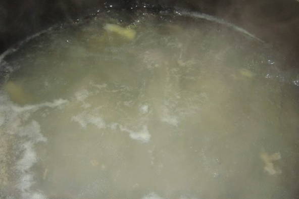 - Zeef de gekookte bouillon door een fijne zeef om het resterende schuim en andere dingen te verwijderen en snijd het vlees indien gewenst in kleinere stukken. Doe alles terug in de pan, voeg de aardappelen toe en breng aan de kook.