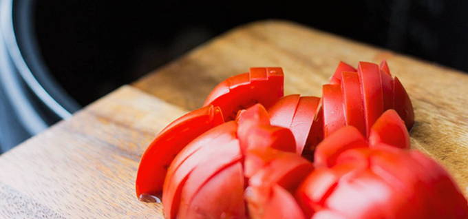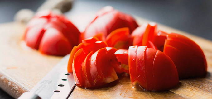 - Snijd de gewassen tomaten in kleine plakjes. Indien gewenst kunt u ze schillen, een kruisvormige incisie maken, ze een paar minuten in kokend water houden en in ijswater dompelen. Dit is niet nodig, maar als de schil van de soorten die je gebruikt dun genoeg is, zullen ze tijdens het kookproces waarschijnlijk loslaten en in de weg zitten.