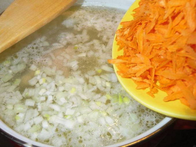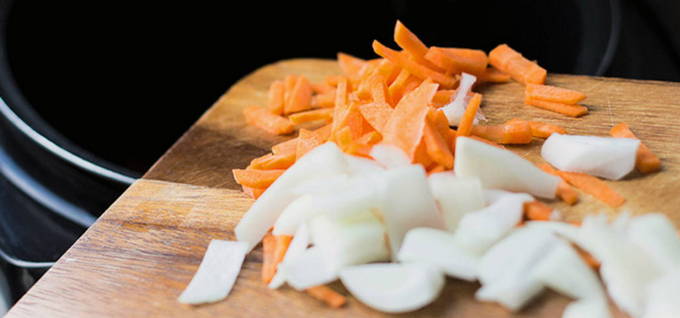 - Schil de ui en wortel en snijd in blokjes of reepjes. Wortelen kunnen op een grove rasp worden geraspt.