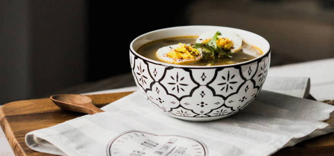- Kook hardgekookte eieren, pel ze en halveer ze. Serveer de soep in borden met elk 2 eihelften.