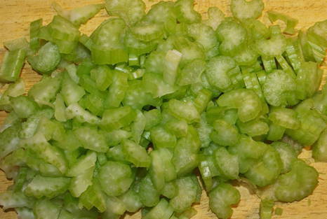 - Verhit een koekenpan met plantaardige olie, bak hierin de ui en bleekselderij goudbruin.