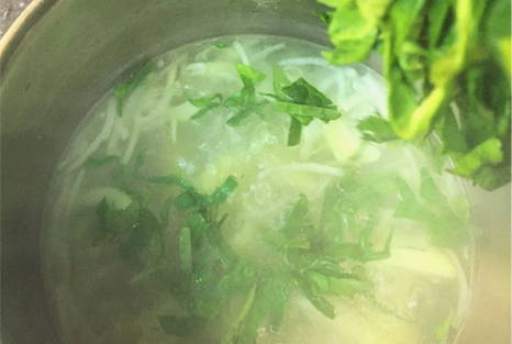 - Was de ui, peterselie en dille, hak ze fijn en voeg toe aan de soep. Laat de inhoud van de pan nog 5 minuten sudderen en haal de schaal van het vuur.