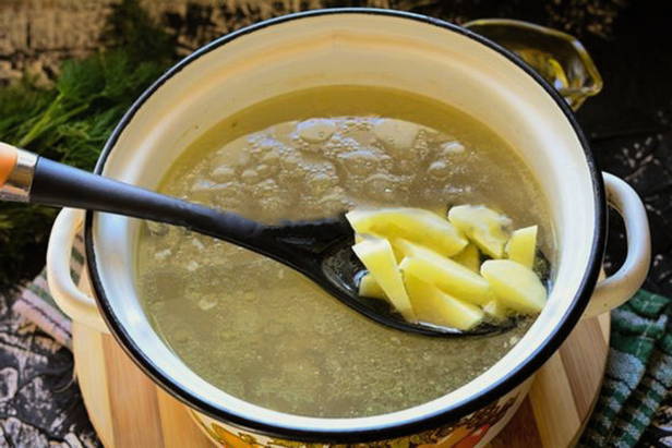 - Voeg de gebakken groenten toe aan de kokende bouillon, leg de gesneden aardappelen op dezelfde plaats en kook nog eens vijf minuten op middelhoog vuur.