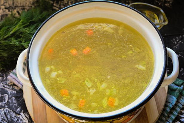 - Was de ui, peterselie en dille, hak ze fijn en voeg toe aan de soep. Laat de inhoud van de pan nog 5 minuten sudderen en haal de schaal van het vuur.