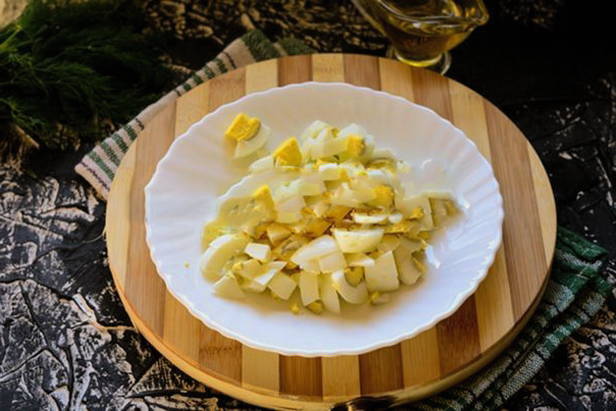 Schil en snijd voorgekookte hardgekookte kippeneieren op dezelfde manier als aardappelen.