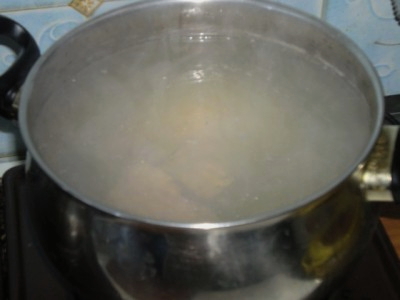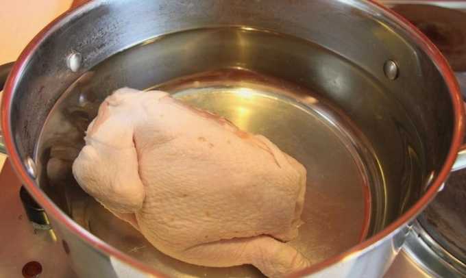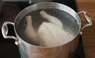 We dompelen de kip onder in een grote pan, vullen hem met water, zout en koken tot hij gaar is.