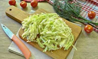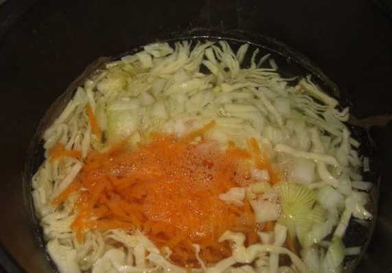 - Snijd de kool en wrijf de wortelen. We sturen groenten naar de kom en vullen met water.