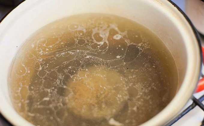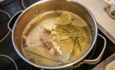 - Dompel de kip onder in een pan met water, voeg zout, zwarte peperkorrels en dillepeper toe. Kook de bouillon.