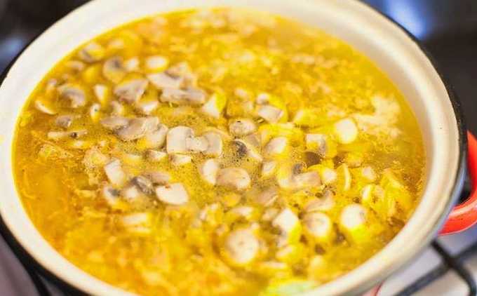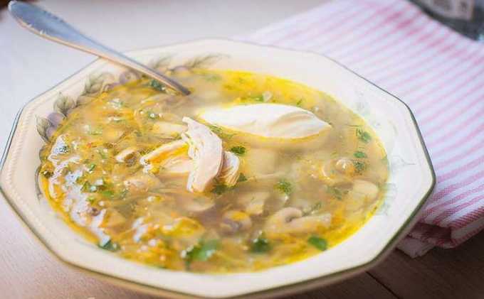 Een van de meest originele recepten voor zelfgemaakte koolsoep is gebaseerd op kippenbouillon met toevoeging van champignons. De combinatie van ingrediënten geeft het gerecht een speciale smaak en een helder aroma.