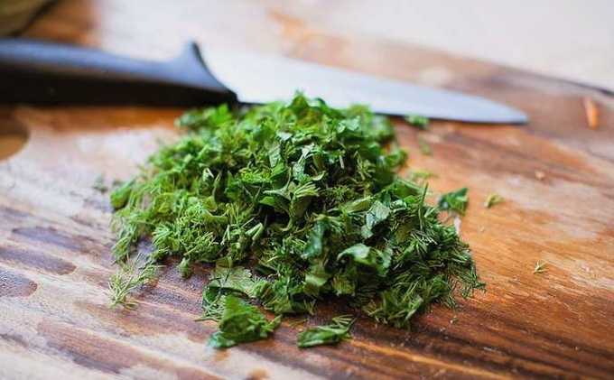 - Zout het gerecht aan het einde van het koken naar smaak, bestrooi met een snufje zwarte peper en gehakte verse kruiden. Kook nog 5 minuten en haal van het vuur.