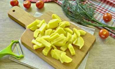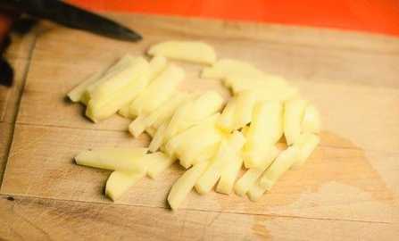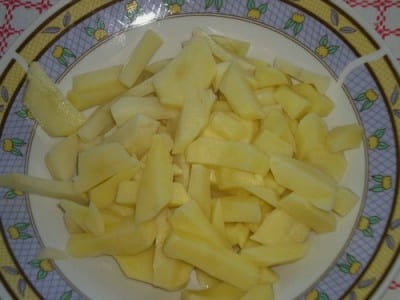 - We maken de aardappelen schoon en snijden ze in kleine partjes. We sturen de groente naar de pan.