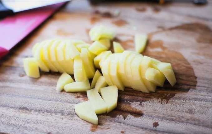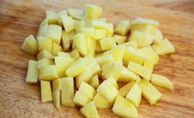 We maken de aardappelen schoon, spoelen ze af en snijden ze in blokjes.