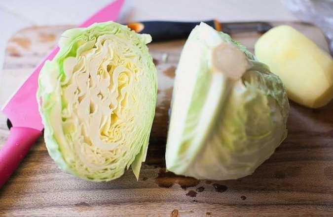 - Bereid witte kool voor soep. We wassen het onder water en verwijderen de bovenste vellen.