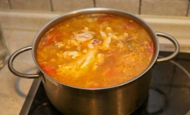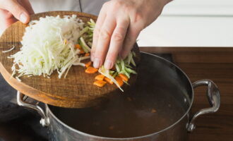 - Kook kippenbouillon. Voeg eerst aardappelen toe, dan kool, wortelen, uien en tomaten. Kook tot alle ingrediënten gaar zijn.