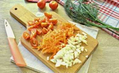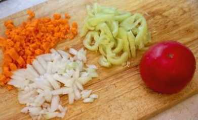 - Laten we de rest van de groenten klaarmaken. Snijd de uien en wortelen. Snijd de tomaten in vieren.