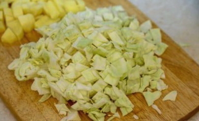 - Snijd verse kool fijn en voeg deze ook toe aan de rest van de producten. Kook op middelhoog vuur.