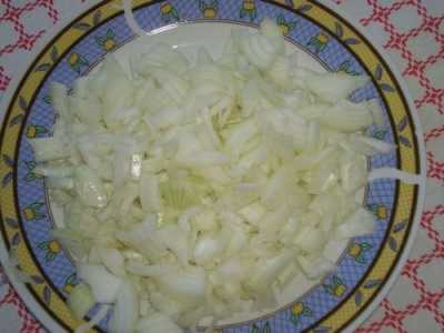 - Snijd de uien in dunne ringen of halve ringen. We leggen het op de filet.