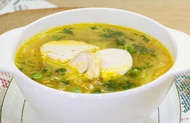 - Giet de afgewerkte soep in borden. Voeg kippenvlees toe en serveer. Eet smakelijk!