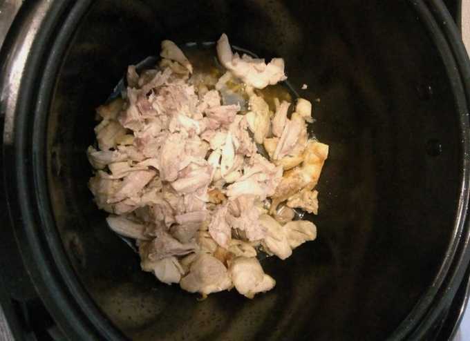 - Kook de kip gaar in gezouten water. Dan halen we het eruit en laten we het afkoelen. Laat de bouillon op het fornuis staan.