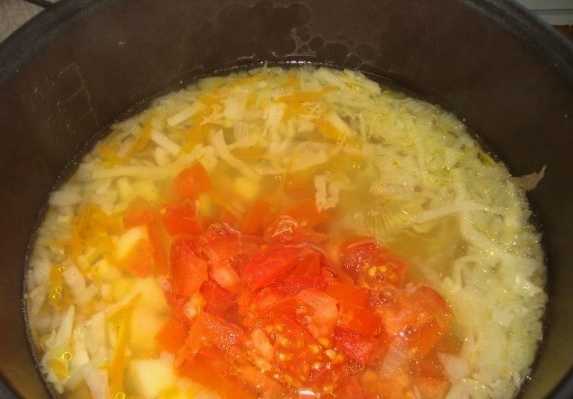 - Giet hete koolsoep met tomaten in borden. De soep kan worden aangevuld met zure room en geserveerd. Eet smakelijk!