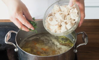 Nadat de aardappelen zacht zijn, snijdt u het kippenvlees en stuurt u het naar de pan. We voegen ook gehakte dille toe. Kook gedurende 3 minuten en haal van het fornuis.