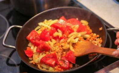 - We verwarmen een koekenpan met plantaardige olie. Bak de bereide groenten daar ongeveer 3-5 minuten. We kiezen hiervoor een laag vuur zodat de producten geen blos krijgen.