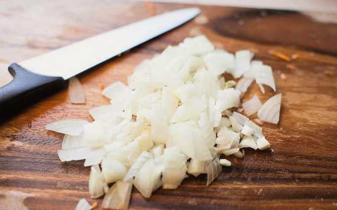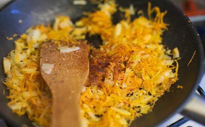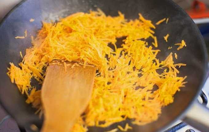 - Snipper de ui, rasp de wortelen op een grove rasp. Bak bereide gerechten 3-5 minuten in plantaardige olie.