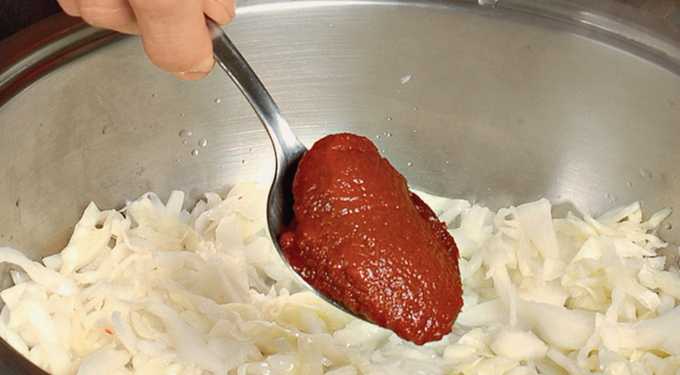 - Maal de kool en bak deze 1-2 minuten in plantaardige olie. Voeg dan de tomatenpuree toe.