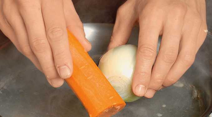 - Voeg de ui toe aan de wortelen, bestrooi met chili en kook nog 2-3 minuten op middelhoog vuur. Nadat we het in de soep hebben gedaan.