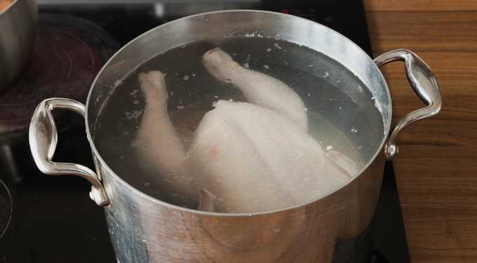 We dompelen de kip onder in een grote pan, vullen hem met water, zout en koken tot hij gaar is.